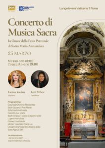 Siamo lieti di annunciare il Concerto di Musica Sacra, che si terrà il 25 marzo 2025 presso Lungotevere Vaticano 1, Roma. L’evento inizierà con la Messa alle ore 18:00, seguita dal concerto alle ore 19:00. Il concerto vedrà la partecipazione del soprano Larissa Yudina, un’artista di talento, accompagnata al pianoforte da Kim Mihee.